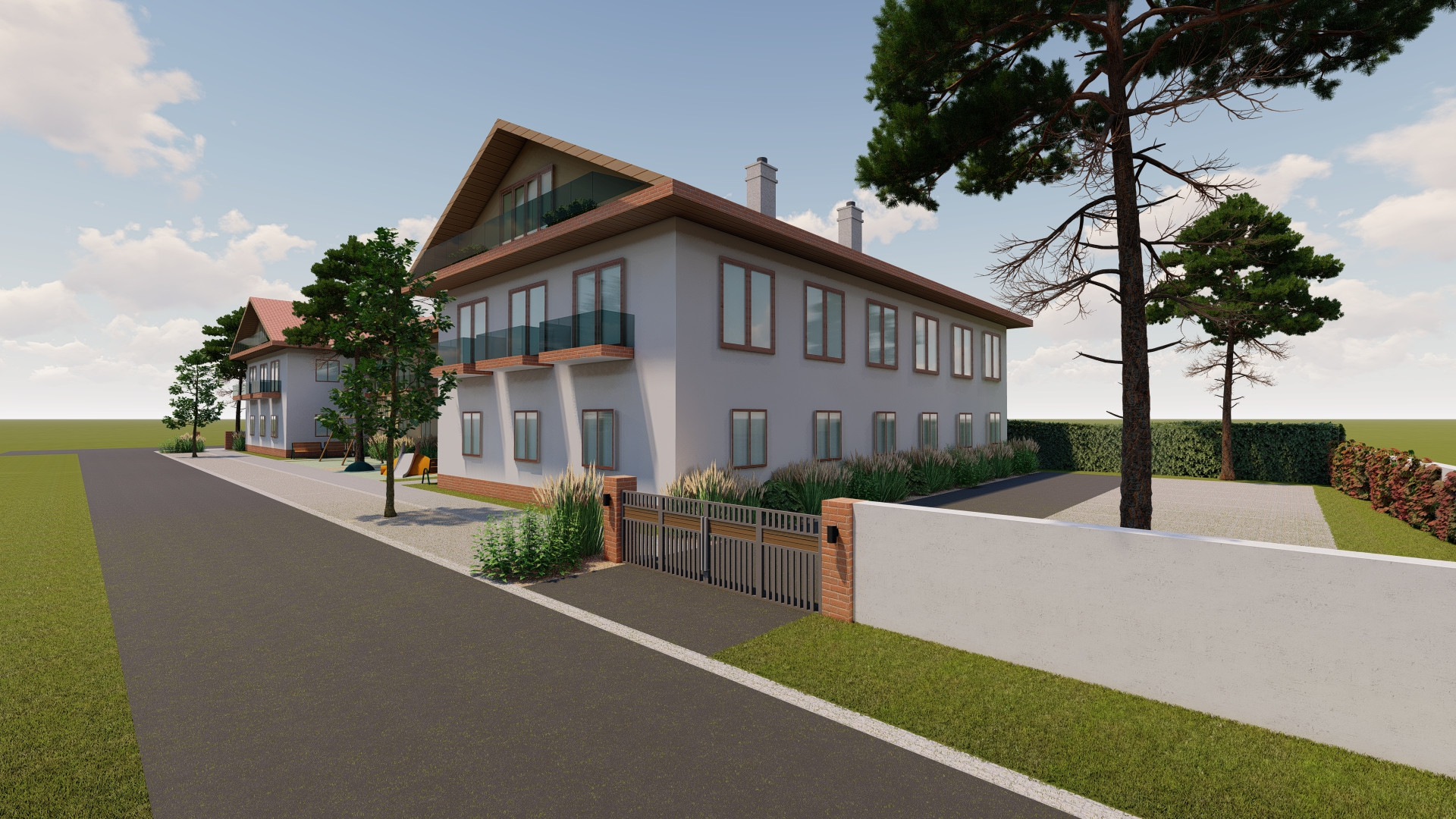 Náš návrh bytového domu spojuje trendy moderní architektury s tradičními prvky a materiály typickými pro jižní Moravu a s respektem k okolní zástavbě.